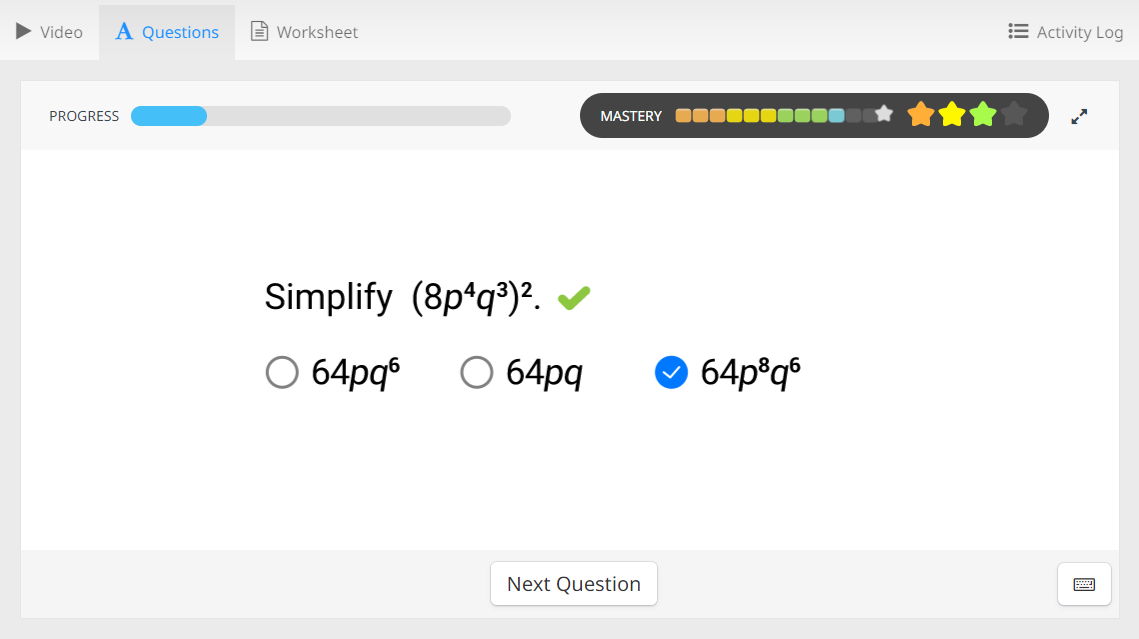 After a student answers a question, the next question chosen is based on an adaptive algorithm. What that simply means is that the questions adjust in difficulty based on the student's ability.